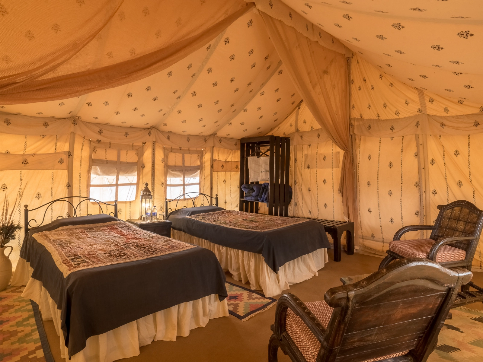 Karma Golden Camp offers a tranquil escape amidst the stunning desert landscape of Rajasthan, surrounded by Khejri trees and majestic windmills. Nestled in the vast expanse of the Thar Desert, this resort seamlessly blends luxury and tradition with unique offerings, including an amphitheater, and a star-gazing deck.
