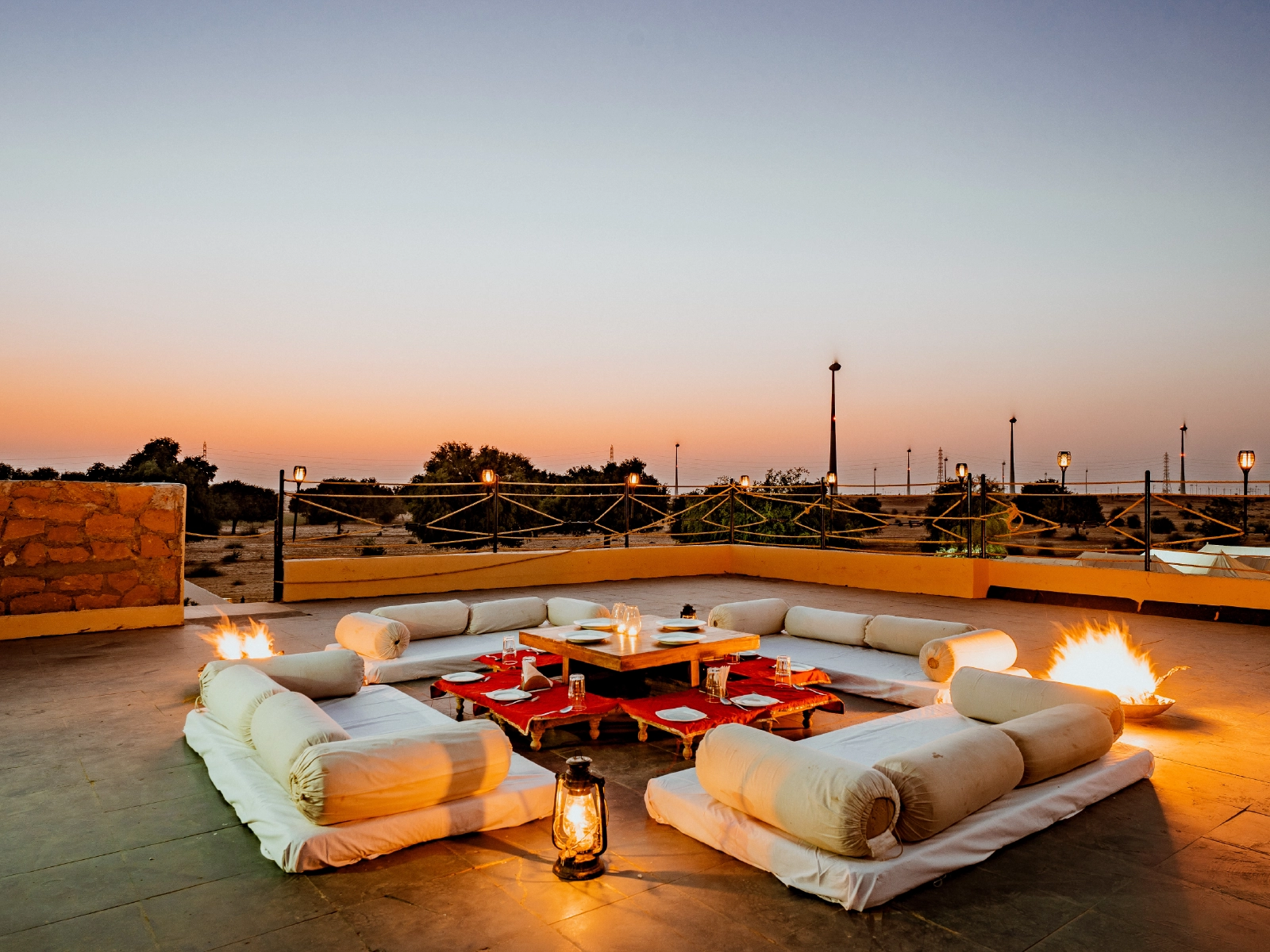 Guests are captivated by mesmerizing evening performances by local folk artists, showcasing everything from Kalbeliya dancing to classical Sufi and Marwari music. Thrill-seekers can enjoy popular activities like camel rides, quad biking, parasailing, and paramotoring, all of which can be easily arranged at the reception.