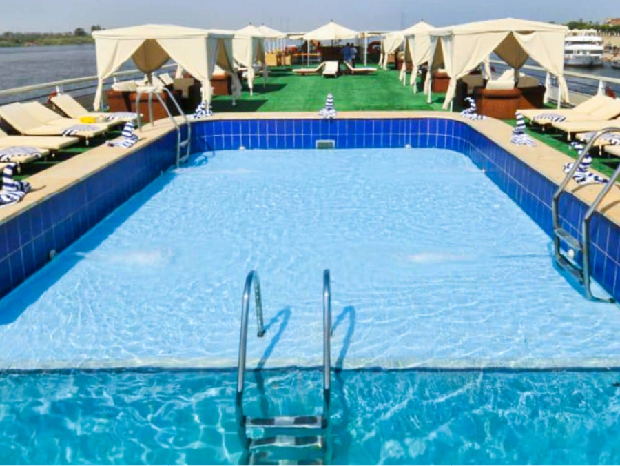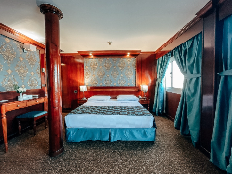 The four-deck Karma Karnak boasts a luxurious swimming pool and sun deck, an elegant restaurant, a vibrant bar, and a stylish entertainment lounge. With rich wood paneling and opulent furnishings, the cabins provide all the comforts you need, including air conditioning, en-suite bathrooms, and large windows that open up on the upper two levels.