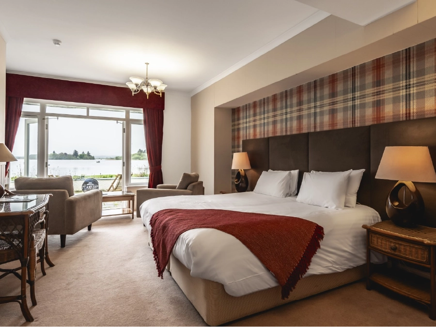 The hotel features spacious, tastefully appointed rooms with en suite facilities and amenities to ensure a comfortable stay. The dining area includes a wooden deck overlooking the tranquil waters, blending tradition and modern comfort with warm oak beams, seasonal local stone, and a grand open hearth fireplace creating a cozy ambiance.