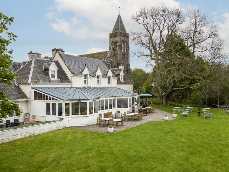 Lake of Menteith Hotel is a tranquil lakeside retreat originally built as a manse for the adjacent church in 1888. This historic property was transformed into a charming inn and later modernized into a boutique hotel in 1937. Situated on the northeastern shore of the serene Lake of Menteith—once known as Loch Inchmahome—the hotel offers breathtaking views and easy access to the iconic Inchmahome Island, home to the ancient abbey ruins where Mary Queen of Scots once sought refuge.